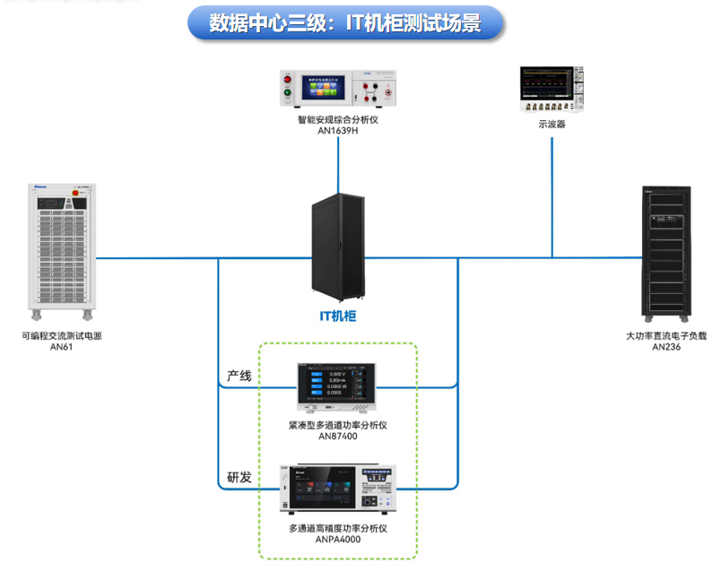 艾诺AIDC数据中心电源全场景测试方案支持多工位并行测试,兼容新能源并网、电池备份单元等混合供电系统的验证,突破传统功率密度限制,为高功耗GPU服务器、液冷机柜等高负载场景提供紧凑型测试解决方案。