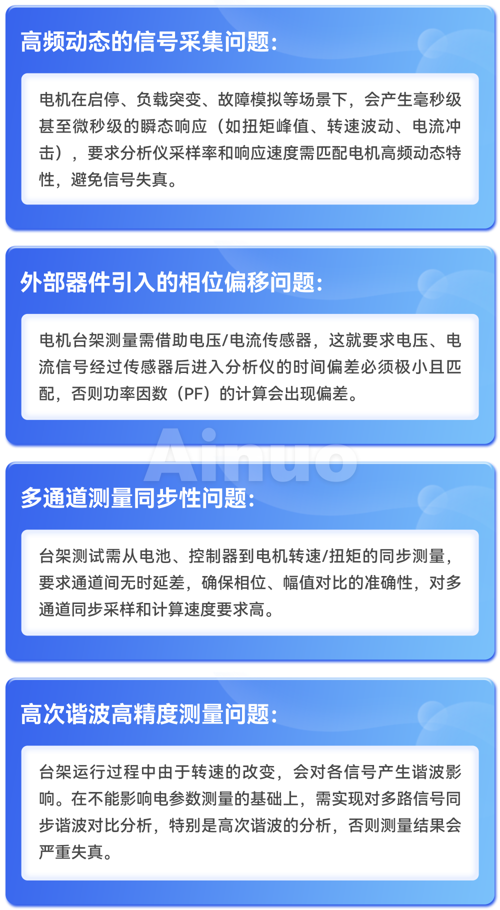 电机台架测试难点贯穿整个测试过程,主要难点可概括为高频动态的信号采集问题、外部器件引入的相位偏移问题、多通道测量同步性问题、高次谐波高精度测量问题等方面。