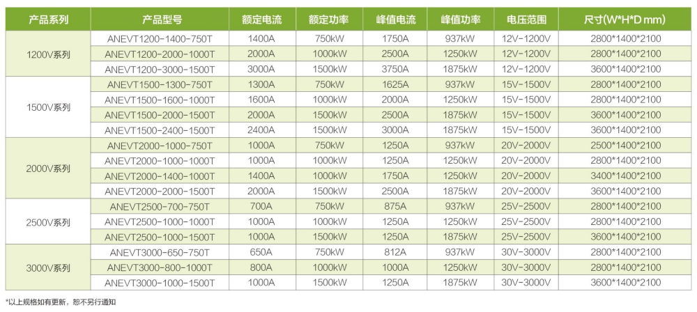 ANEVT-T系列大功率双向直流测试电源单机最大功率1.5MW,电压等级为1200V、1500V、2000V、2500V、3000V。其集成了高频PWM整流技术、双向DC变换技术以及FPGA数字控制技术。具有自适应电网回馈功能,可满足全功率段持续能量回馈电网。正反向输出无缝切换功能,可实现能量传输的无缝对接。双环路控制技术,实现超高控制精度,以及对客户设备应用快速响应,保证设备测试稳定性和测试数据的准确性。超宽范围的电压电流输出能力,丰富的输出编程测试功能,更好满足客户不同产品测试的需求。设备还具有多重保护编程功能,能够更好的保护客户设备在测试过程中的安全性。
