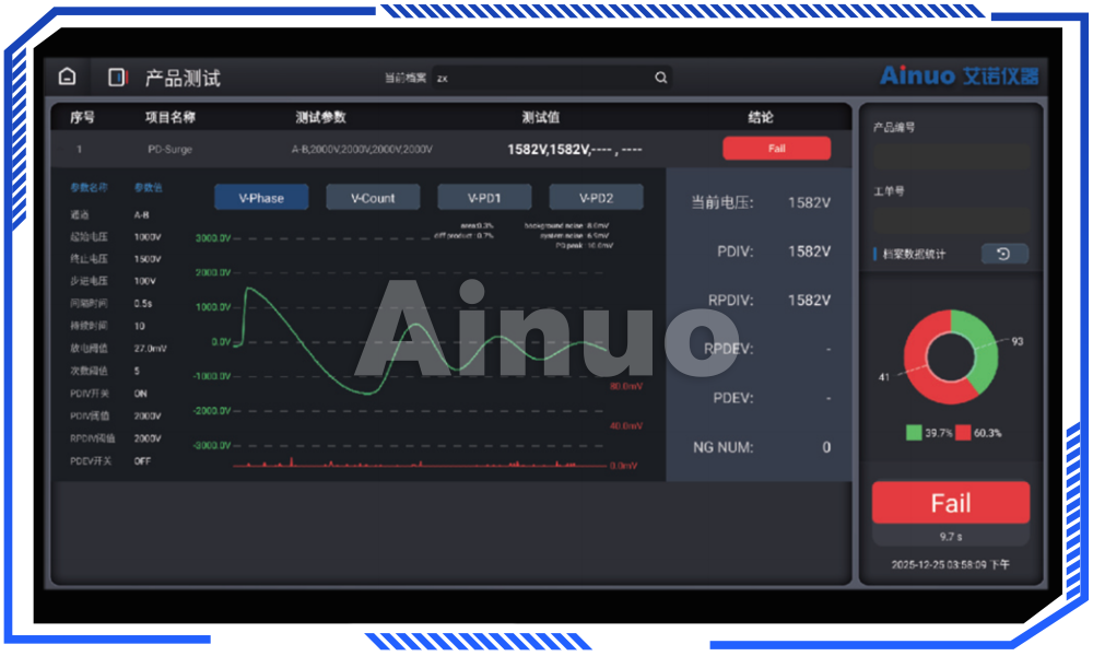 艾诺仪器深耕电机及电气测试领域多年,聚焦新能源汽车驱动电机在高电压测试中面临的绝缘可靠性挑战,专项研发推出高精度高稳定性电机匝间绝缘测试系统解决方案。该方案集成高精度高压脉冲发生与纳秒级波形采集技术,可精准执行匝间绝缘及局部放电(PD)检测。同时,通过对标准波形与测试波形进行多参数智能比对,涵盖面积差、差积、相位差及电晕特征等,高效识别绝缘薄弱点、匝间短路、焊接不良及工艺瑕疵等潜在缺陷,为高压驱动电机的绝缘性能验证提供安全、全面、可靠的数据支撑,显著提升测试效率与缺陷诊断精准度。