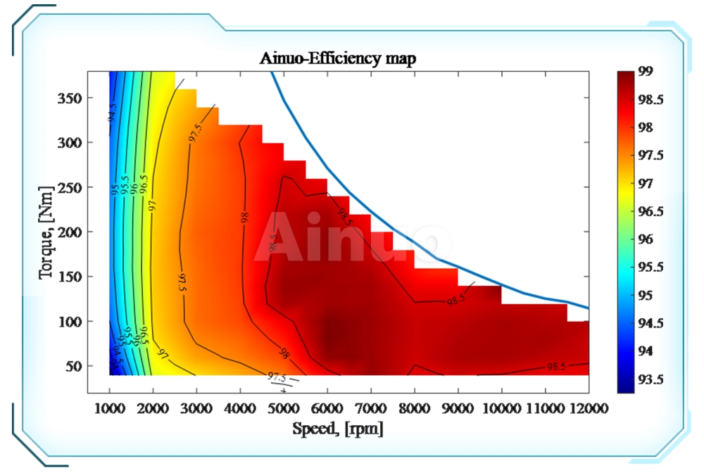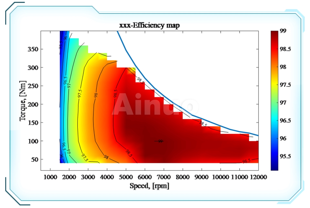 真实台架和电机模拟器的电机控制器效率MAP图测试对比。整体效率控制误差≤±0.9%。